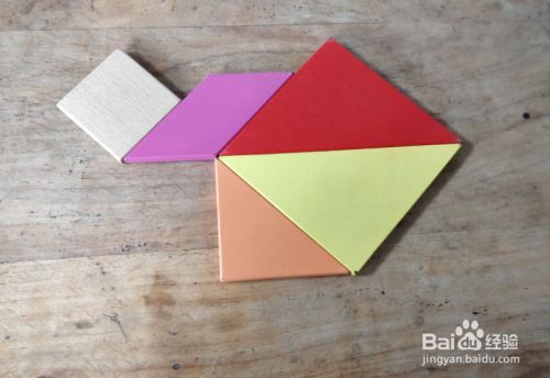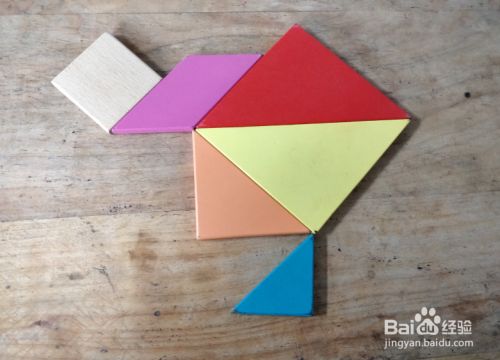 摆上余下的小三角形,放在下侧大三角形的右侧挨着,直角在右侧上端,如图。奔跑的小鸡就拼好了。
