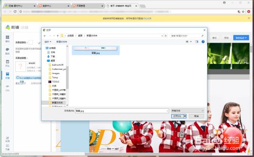 在打开页面中找到电脑上保存的通栏的店招背景图,点击【打开】。如果不知道上传什么样的图,可以查看下方引用的链接