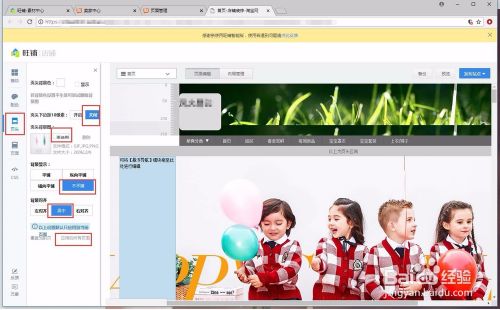 然后选择【不平铺】,背景对齐设置为【居中】,关闭页头下边距10px,点击【应用的所有页面】,可以看到已经店招背景已经变成全屏啦
