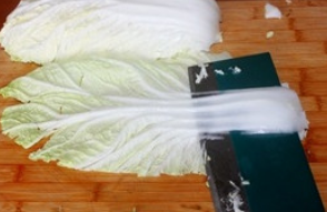 3.每一片的白菜帮部分都用刀平着片薄。