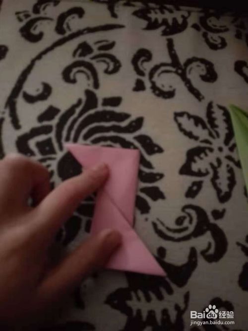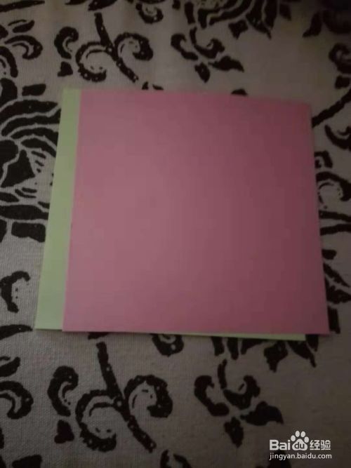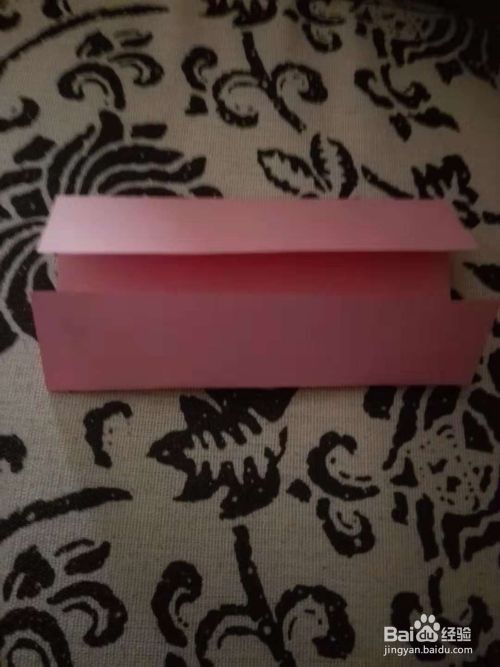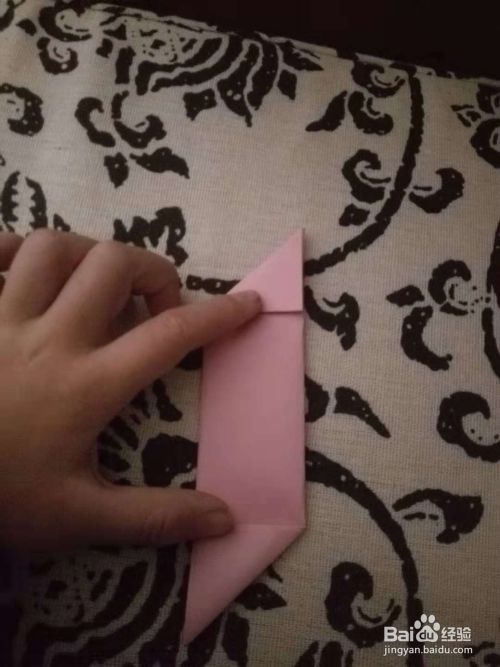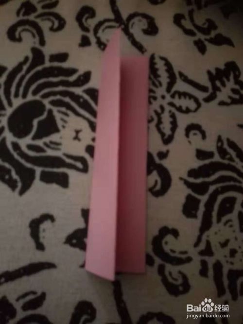 首先处理粉色彩纸,将折纸上下对折,折出折痕,并将上下两边折至刚才的折痕线处。