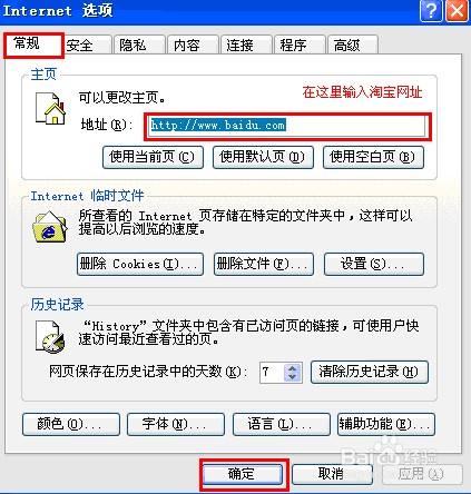 在常规选项卡中找到地址栏,删除原先的地址,输入淘宝网网址:http://www.taobao.com