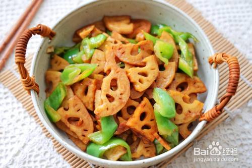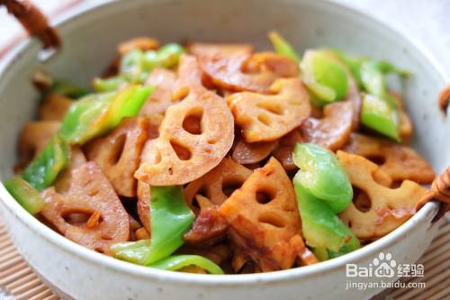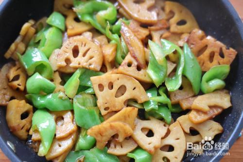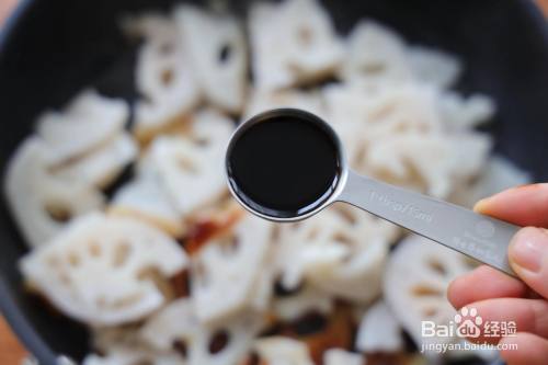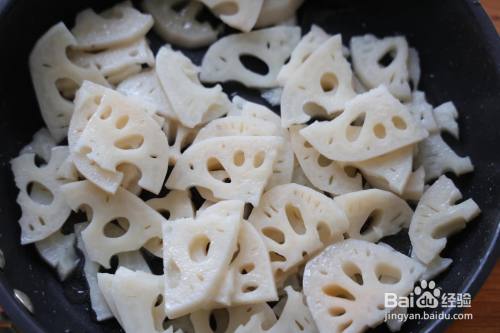 利用锅底剩余的油把藕片倒进去翻炒均匀;