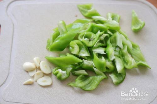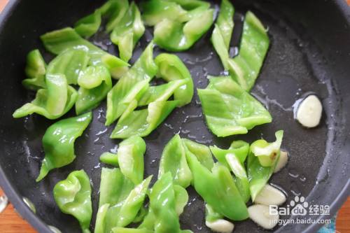 锅里加点植物油,油热后把蒜片和青椒倒进去翻炒出香味,盛出来备用;