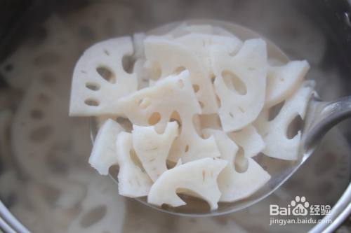 莲藕片放在开水锅里焯水,大约焯水2-3分钟左右,捞出来放在清水里备用;