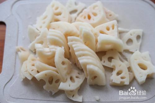 莲藕去皮后洗净,切成稍微厚一点的片,放在清水盆里浸泡;