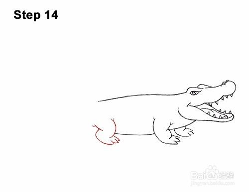 第14步:首先画一条短曲线,在左边添加卡通鳄鱼的后腿。在后腿的左侧边缘上相互叠加两条较短的曲线。现在在脚趾处画出三条短V形线。