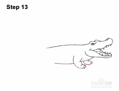 第13步:以相同的方式在另一侧画鳄鱼的前腿,但稍小一点。这条腿的顶部将位于身体的后面,所以只绘制下半部分。在前腿的左侧,为下侧画一条长而弯曲的水平线。