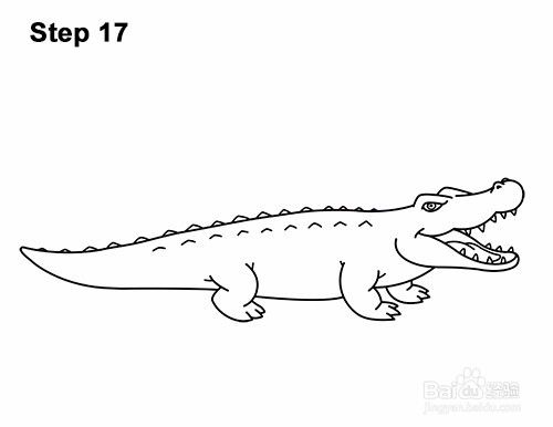 第17步:使用钢笔或标记,仔细检查线条,使鳄鱼/鳄鱼的绘画永久。上墨后,用橡皮擦去掉每个铅笔标记。