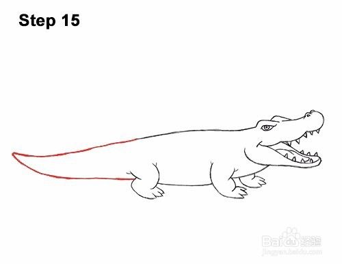 第15步:继续绘制背面朝左的线以创建鳄鱼尾巴的顶部。在底部添加另一条长线以完成尾部的形状。确保尾巴到达左侧的一个点。如果你愿意,你还可以让尾巴更长。