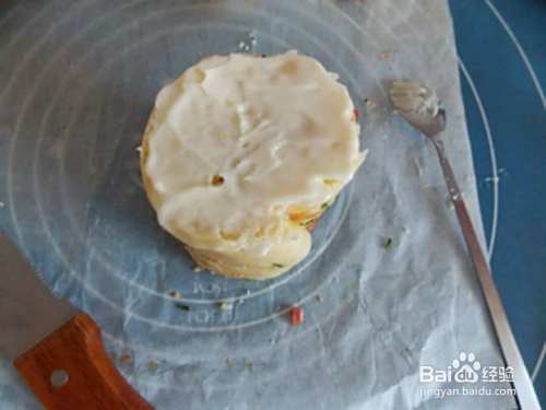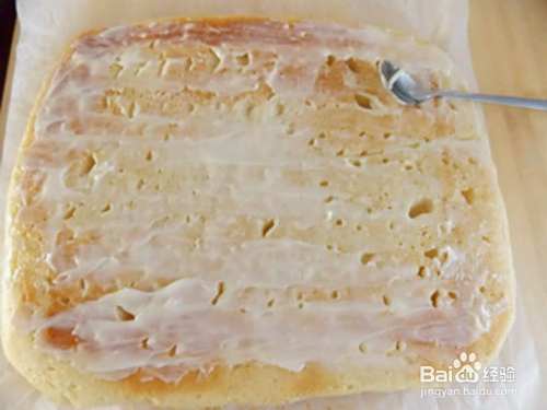 面包晾至微温的时候,撕掉保鲜膜,将面包翻面,涂抹上沙拉酱。
