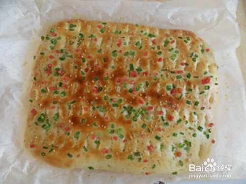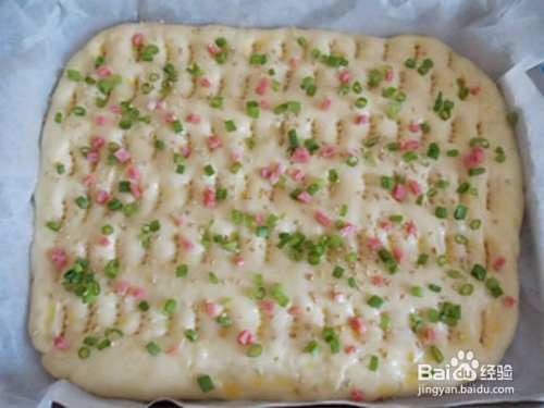 表面刷蛋液,之后撒上香葱碎,香肠碎以及芝麻。