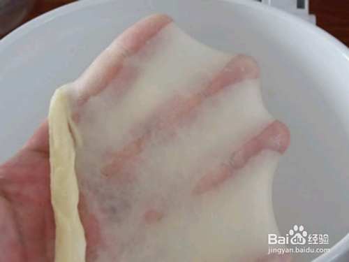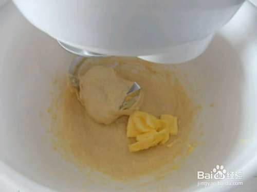 将除黄油外的所有制作面团的材料放在一起,揉至扩展阶段,之后加入黄油。