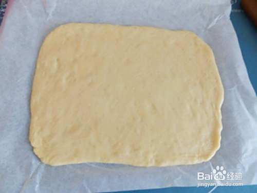 松弛好的面团,放在事先裁好的油纸上面,擀成同烤盘大小形状相同的大片。
