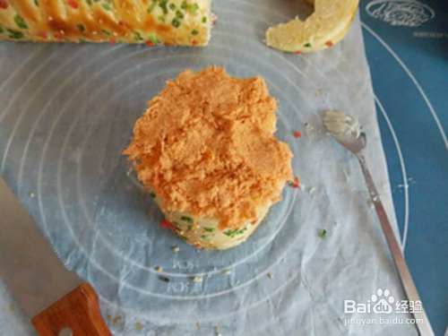 在均匀的黏上肉松。依此方法把所有得都做好。