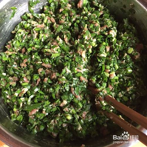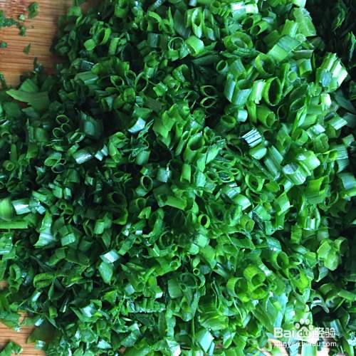 将清洗好的韭菜和小葱切成小段,然后倒入肉泥中,放入食用油,盐、花椒粉、老抽等调料,搅拌均匀