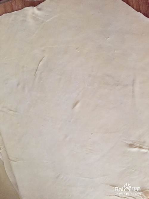 将和好的面那出来多揉会儿,使面光滑,然后用擀面杖将面团擀成圆形的面饼,厚度与正常的饺子皮厚度相似