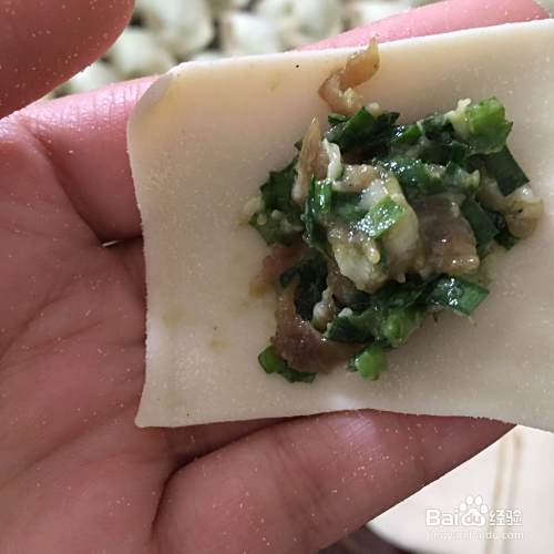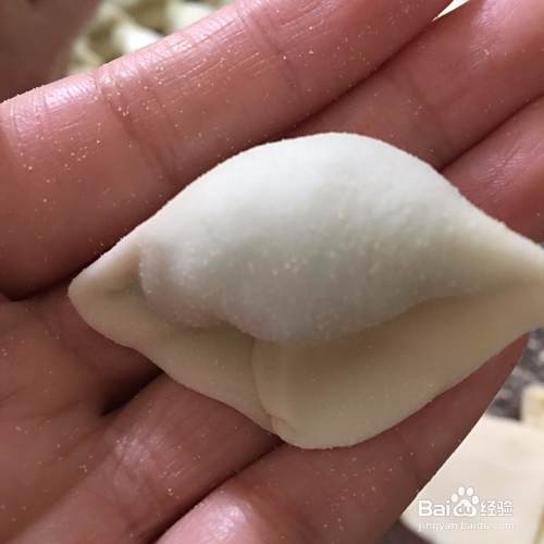 拿起一个面片,放入饺子馅儿,然后包起来,这样一个饺子就包好了