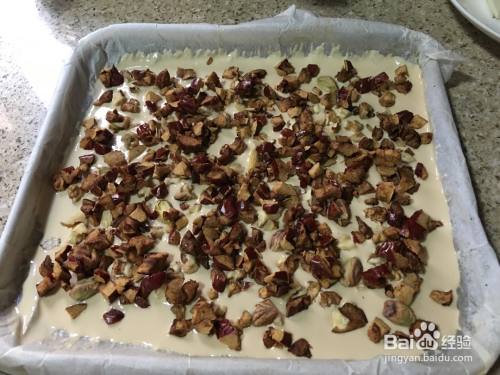 烤盘垫上油纸,刷薄薄的一层油,到一点点面糊,晃动将整合烤盘铺满就可以了,在撒上坚果红枣碎,放烤箱烤大约5分钟定型