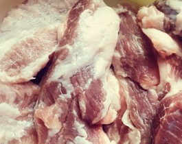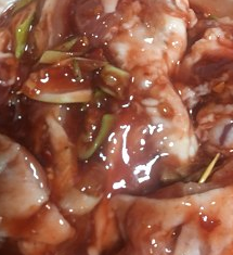 将肉洗净,厨房纸吸干水分,腌盆中放叉烧酱、南乳、白酒、葱白、大蒜粒、蜂蜜、盐拌匀.