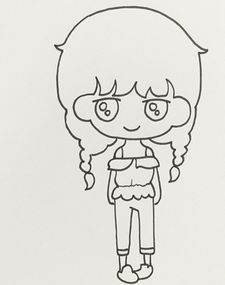 然后再将女孩的双腿画出来,画出裤脚边线后,将脚上的鞋子也画好。