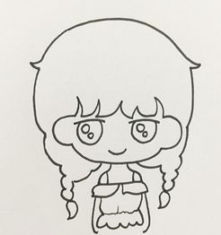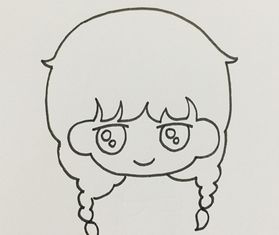 画出女孩的头发轮廓与两侧的麻花辫后,在面部区域画出大大的眼睛与微笑着的嘴巴。