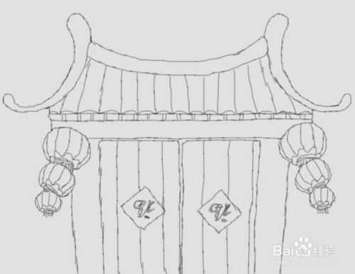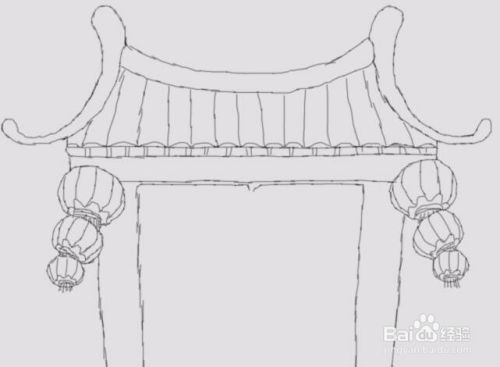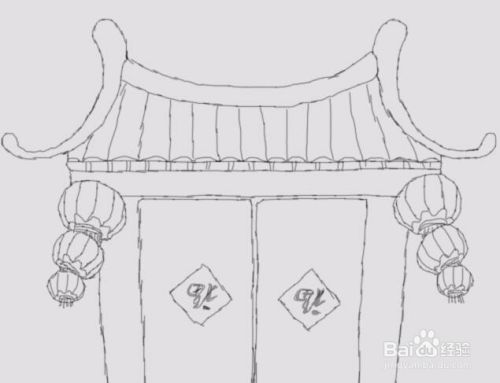再在灯笼的下面画出房子的墙体及大门,如图所示:
