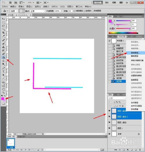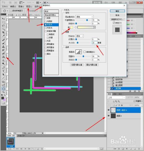 本经验主要讲述使用PS如何设计霓虹灯边框,绘制直线,复制多条直线,填充各种颜色,设计成矩形框,最后设计外发光,达到唯美效果。