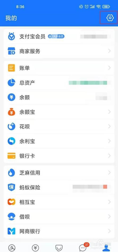打开支付宝app,在我的页面点击右上角的设置图标。