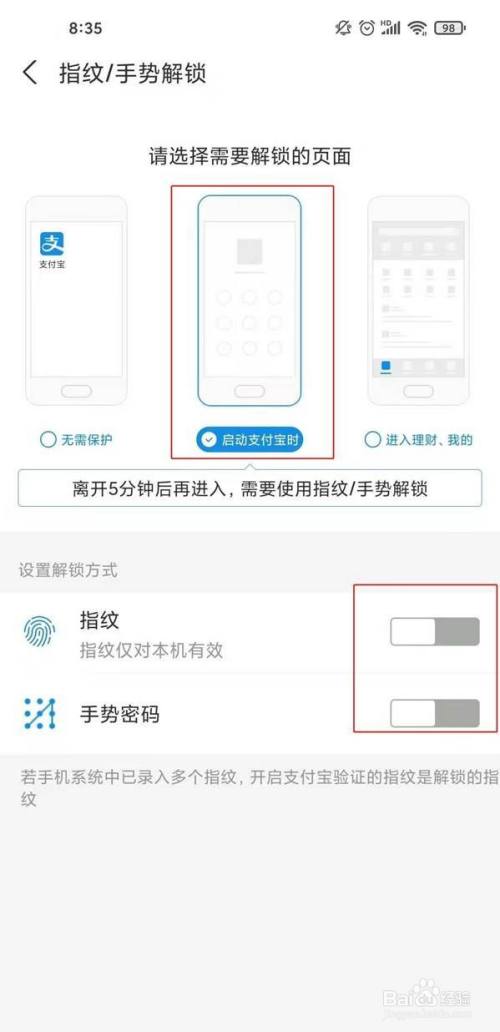 4、点击启动支付宝时,将手势密码的开关开启即可。