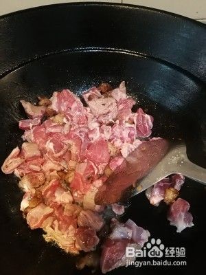 油渣和少量熬出来的油留锅里,开大火,下羊肉翻炒,加料酒。
