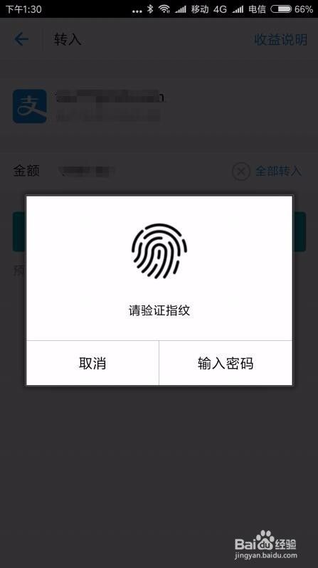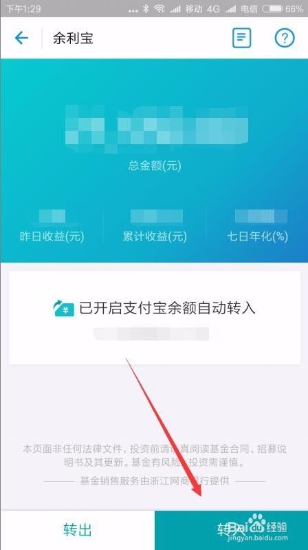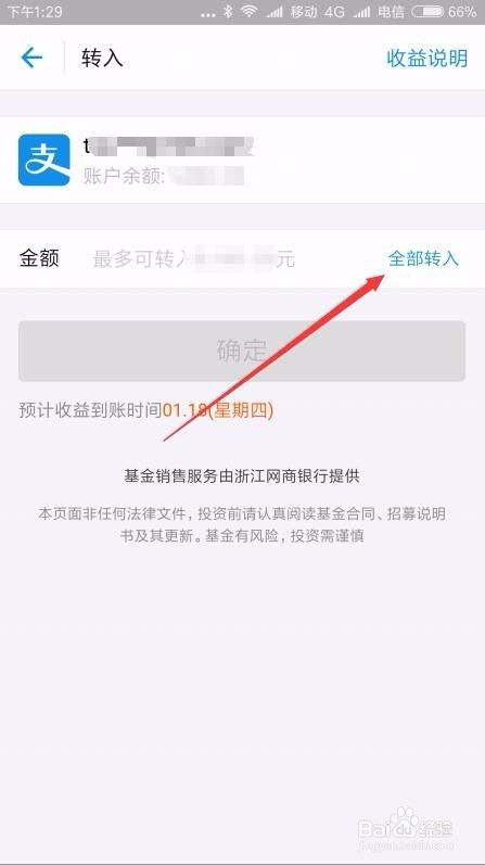 这时会打开余利宝的转入页面,在这里可以输入要转入的金额,也可以点击“全部转入”按钮。