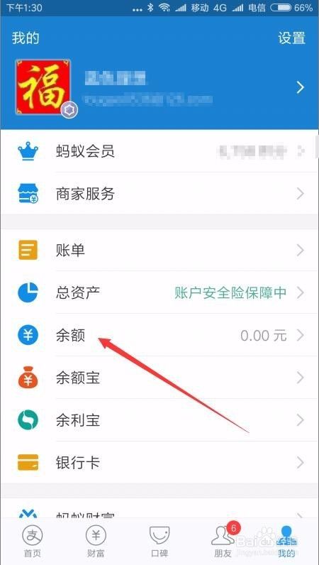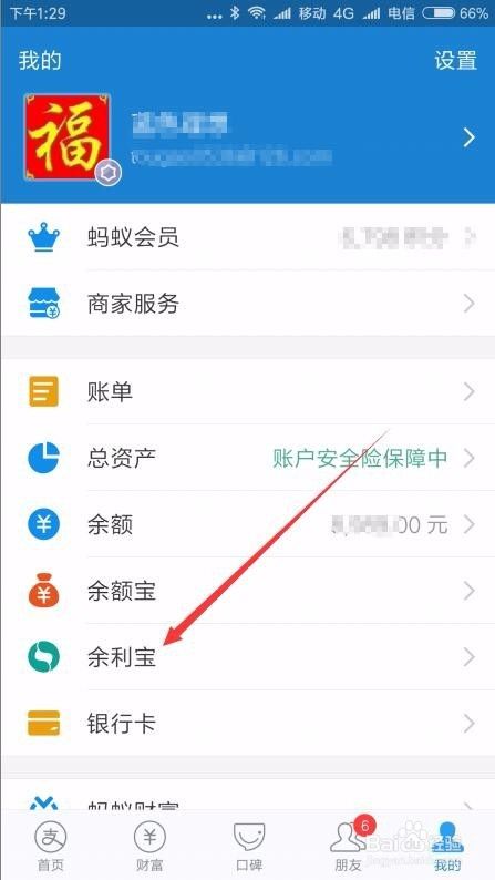 充值完成后,回到支付宝的我的页面,点击“余利宝”菜单项。