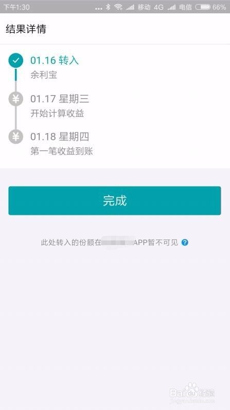密码正确后就可以把余额全部转到余利宝中了,同时显示出转入的时间与收到收益到账时间等信息。