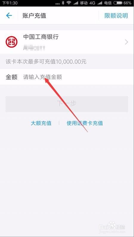 在打开的账户充值页面中,选择要充值的银行卡,然后输入充值金额,点击下一步按钮后就可以充值成功了。