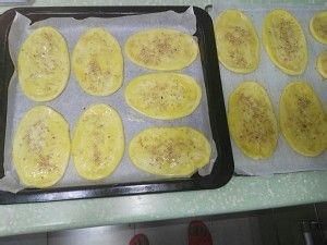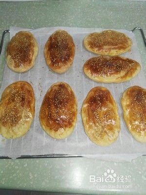 3.面饼包糖馅收口向下,擀成长条牛舌状,放入烤盘。