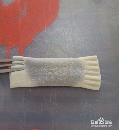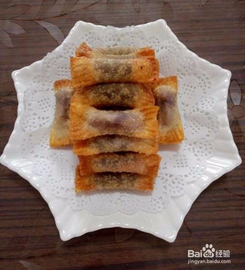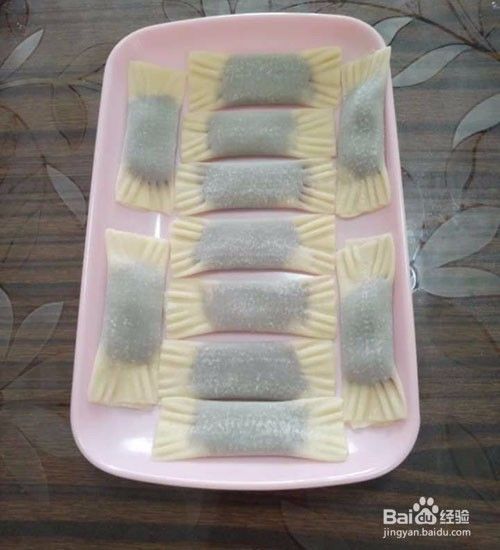 先将四边摸上一点水,再卷起包好后,用叉子把两边压出花边,全部包好放到盘子里。