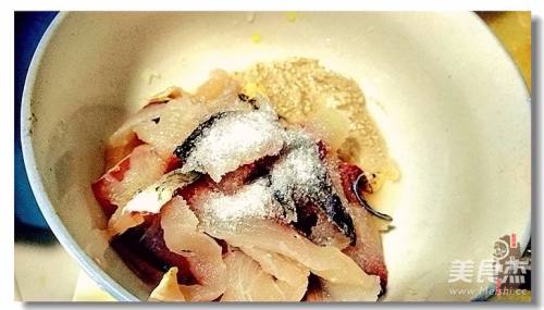 6鱼片挤去水分,加入盐、料酒、味精和加水的红苕粉;
