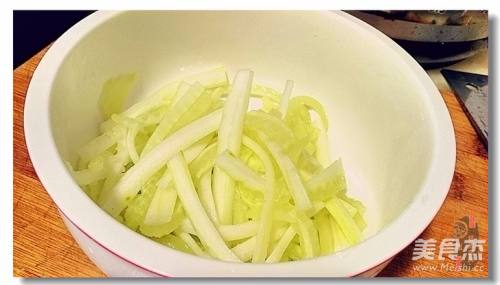8黄瓜条和莴笋头条挤去盐水放在盘底;