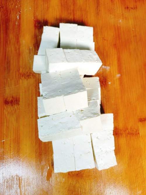 2豆腐改刀切4×4厘米方块,备用。
