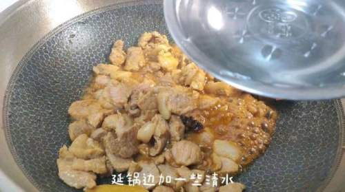 10猪肉翻炒至断生,沿锅边加入清水,可以多加一些,一会炖菜会消耗比较多的汤汁。