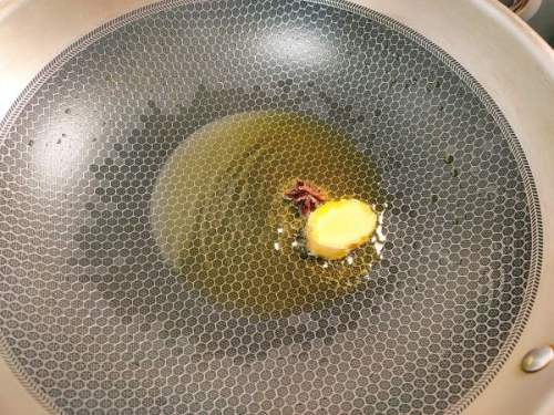 5热锅凉油,下姜片和八角。炒出香味。