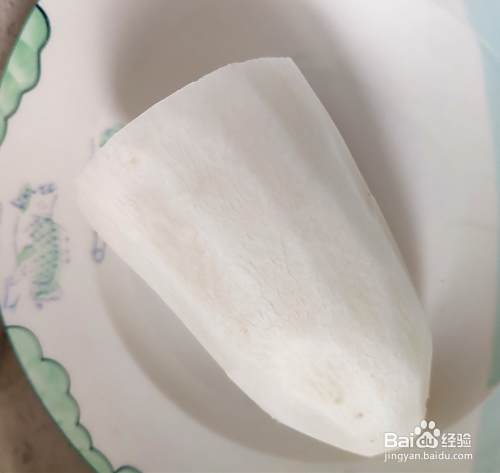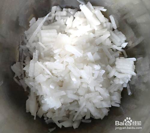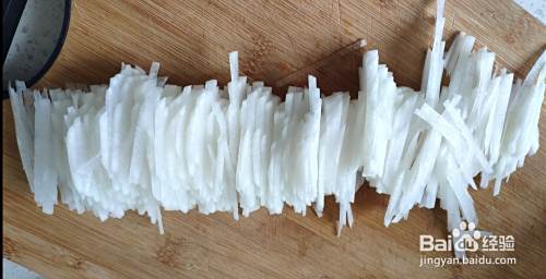 准备半个白萝卜,削皮后切细丝,再切短至1公分左右长,太长了不易成丸子,太短又没了萝卜丝丸子的精髓。