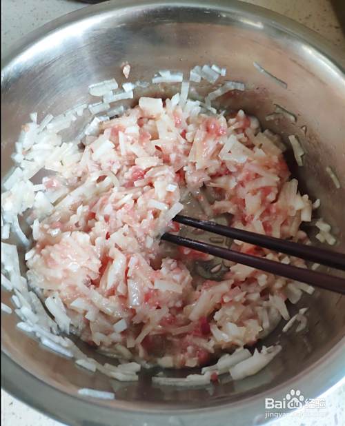 把腌好的萝卜丝沥干水分,加入一个鸡蛋,再加一些肉馅,搅拌均匀。