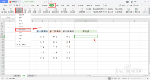 在菜单栏里选择公式,打开常用函数下拉框,点击里面的AVERAGE函数。