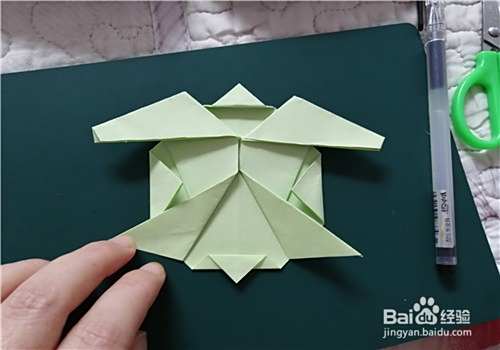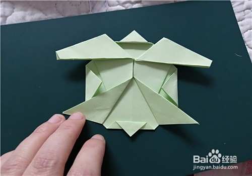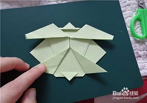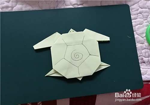 两侧都折好后,我们把彩纸翻到正面,画上眼睛,再在龟壳上画上图案就完成了。