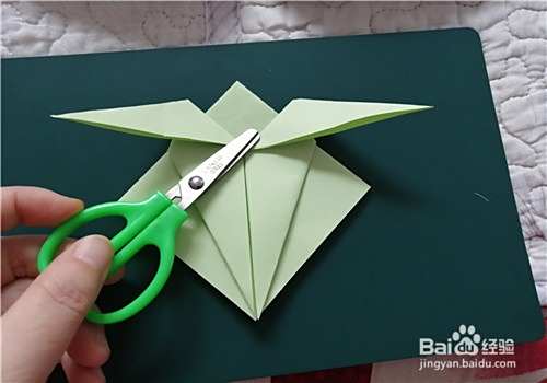 我们用剪刀,把上面的角剪开,如图一。再把两个角向外分别翻折,如图二。