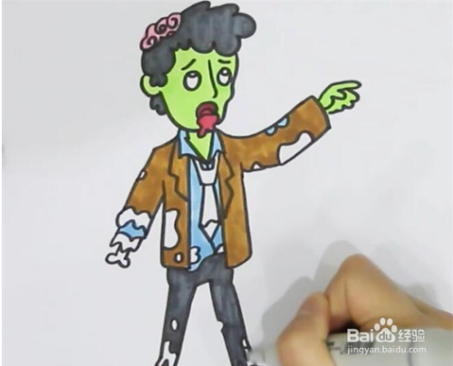 先画丧尸的头部与五官,往下画出它的身体衣服与动作,一手上抬,一只脚光着,衣服上还要画出污渍痕迹,皮肤涂绿,将头发涂黑,嘴巴涂红后,衣服用蓝、棕、黑三色涂上,最后将污渍痕迹全部涂成红色的,可怕的丧尸就画好了。