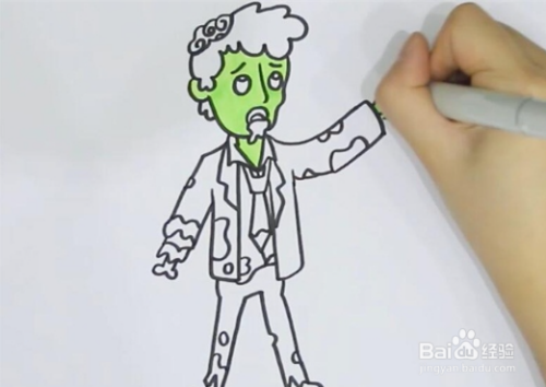 接着将丧尸的下半身补充画出,一只脚光着,然后将它的皮肤涂成绿色的。