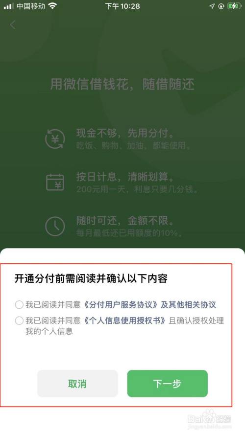 点击查看分付额度,进入开通界面,勾选同意,进入下一步即可。